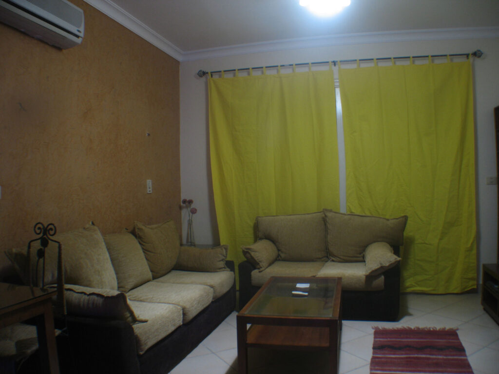 غرفه المعيشه بها اريكه مريحه و طاوله قهوه, ومكتب صغير و تليفزيون 32 بوصه مسطح و جهاز استقبال قنوات فضائيه